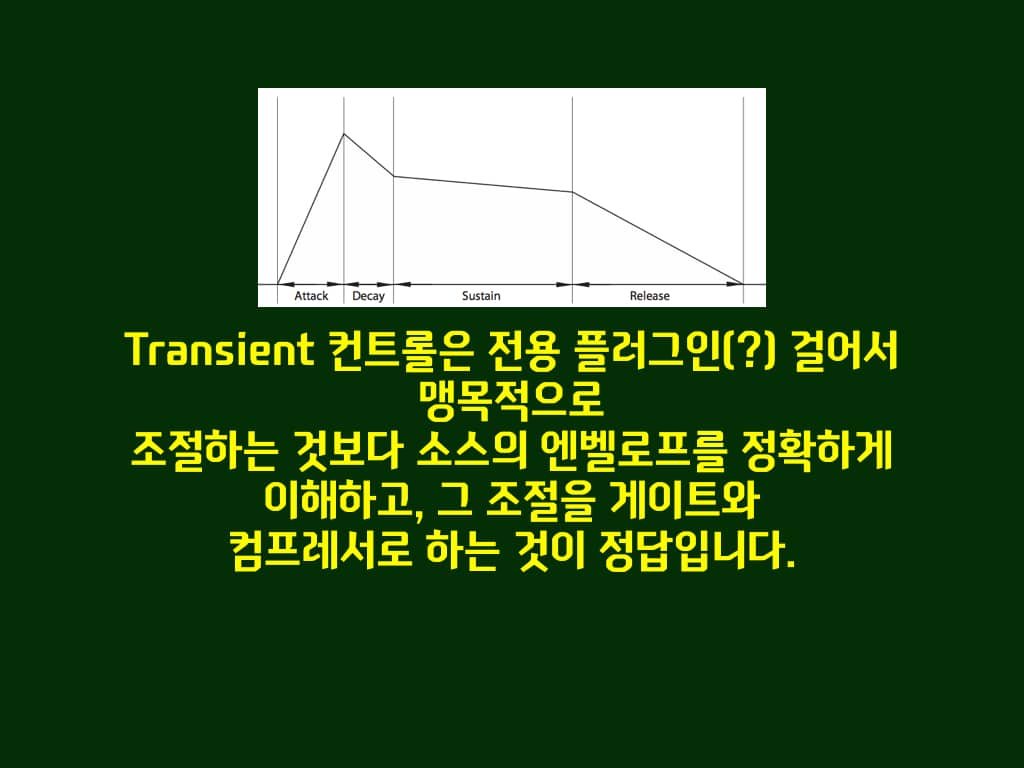 Transient 컨트롤은 전용 플러그인(?) 걸어서 맹목적으로 조절하는 것보다 소스의 엔벨로프를 정확하게 이해하고, 그 조절을 게이트와 컴프레서로 하는 것이 정답입니다. 하긴, …