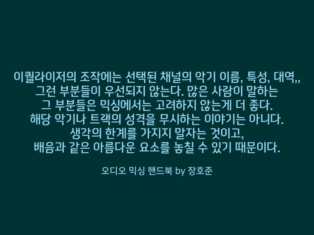 목적을 가지고 이퀄라이저 조정을 해야만 합니다. 원하는 소리를 만들기 위해서 부스트를 더 많이 할 수도 있지만, 컷을 통해 안좋은 대역을 …