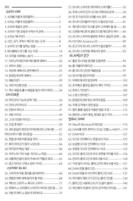 특히 음향엔지니어가 아니면서도 관련 음악 프로덕션 관련 기술이 필수인 작편곡자, 프로듀서, 연주자, 아티스트들이 쉽게 개념과 기술을 이해할 수 있게 쓰여졌습니다. 총 145개의 주제에 대해 세부적이면서도 깔끔하게 정리해드립니다.