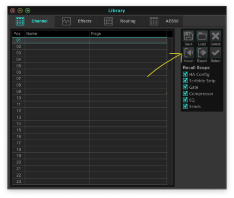 그러면 다음 화면이 열립니다. 이 그림처럼 Channel을 선택한 다음 01번을 선택합니다. Recall Scope의 모든 항목을 다 선택한 다음 화살표의 Import를 클릭합니다.